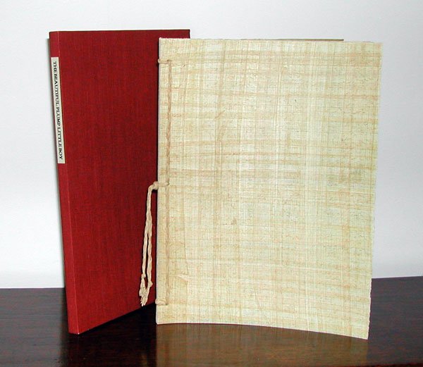 - Text is set in 18 pt Poliphilus bold, printed on Hahnemuhle 'old antique' laid paper on a Vandercook proofing press and an Arab treadle platen. Sewn by hand with plaited raffia from Madagascar, and covered with papyrus, in a slipcase, by Salisbury Bookbinders.