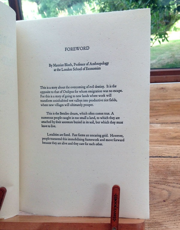 Maurice Bloch, Professor of Anthropology at the London School of Economics, has written a perceptive and moving foreword. The story was collected and translated by Luke Freeman. He writes ‘ ... His parents could never have imagined, back on that dark and windy hilltop, that the story of their beautiful plump little boy would one day be written down. Even less, that it would end up on another continent, a hand-printed book in your hands. The book you are holding may well outlive you. Its story certainly will.’